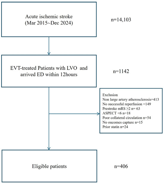 We analyzed data from four university-affiliated, prospectively maintained multicenter stroke registries, enrolling consecutive patients with acute ischemic stroke between March 2015 and December 2024. From this cohort, we selected individuals who experienced LVO in the anterior circulation and underwent EVT. Only patients who achieved successful reperfusion, defined as a modified Thrombolysis in Cerebral Infarction (mTICI) score of 2b or 3, were included. We excluded patients based on the following criteria: (1) premorbid modified Rankin Scale (mRS) score > 2; (2) Alberta Stroke Program Early CT Score (ASPECTS) < 6; (3) time from symptom onset to groin puncture exceeding 12 h; (4) poor collateral circulation assessed by multiphasic CT angiography (mCTA); (5) prior use of statins before the index stroke; and (6) missing data on 3-month functional outcome.