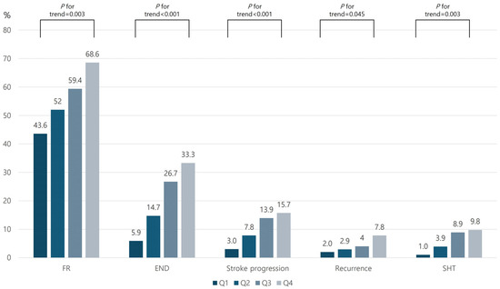 Of the 406 enrolled patients, 227 (55.9%) experienced FR and 82 (20.2%) developed END during hospitalization. The frequency of both FR and END increased progressively with higher AIP quartiles (p for trend = 0.003 for FR; p < 0.001 for END). When END was categorized by etiology, the rates of stroke progression, recurrence, and SHT were all higher in the highest AIP quartile (Figure 2).