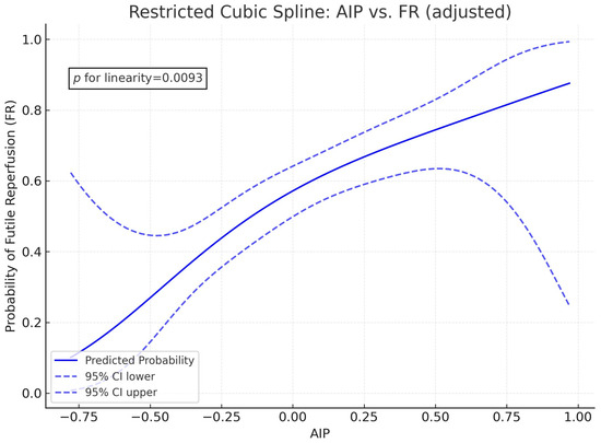 Figure 3. Restricted cubic spline showing correlation between AIP levels and FR. Abbreviation: AIP, Atherogenic Index of Plasma; FR, futile reperfusion. Adjusted for age, male sex, initial NIHSS, time interval from onset to arrival, history of HTN, smoking, LDL level, and glycated hemoglobin.