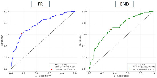 ROC analysis demonstrated the AIP’s good predictive accuracy for both outcomes: the area under the curve (AUC) was 0.775 [95% CI: 0.731–0.818] for FR and 0.726 [95% CI: 0.659–0.784] for END (both p < 0.001). The optimal AIP cutoff values were 0.64 for predicting FR and 0.21 for predicting END (Figure 4).