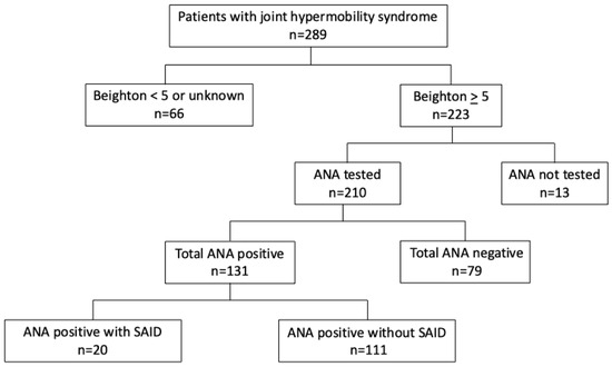Based on the commonly recognized definition of JHS/hEDS as a Beighton score of five or above, we narrowed down our initial cohort from 289 to 223 patients (Figure 1). We further excluded those patients who did not have an ANA test performed, which brought our cohort down to 210 patients. Of the 210 patients in which ANA results were available, a positive ANA test (ANA+) was found in 131 patients and a negative ANA test (ANA−) in 79 patients. Within the ANA+ group, 20 patients met criteria for definitive systemic autoimmune disease (SAID) and were analyzed separately from the remaining cohort of 111 ANA+SAID− patients (Figure 1). The SAID diagnoses included SLE, MCTD, SjS, pauci-articular JIA, sarcoidosis, polymyositis, primary biliary cirrhosis, and HLA-B27+ oligoarticular asymmetric inflammatory spondylarthritis.