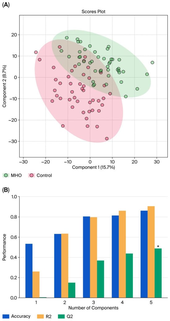 Partial least squares discriminant analysis (PLS-DA) of control and MHO groups. (A) The PLS-DA 2D scores show a difference between the MHO and control groups. The red dots represent the MHO samples, while the green dots represent the controls. Data from the three areas of the placenta (center, periphery (1–2 cm from the placental edge), and middle (between these two sections)) and each set of three samples per placenta were pooled. (B) Cross-validation chart: PLS–DA classification performance showed that the best classifier was obtained using 5 components, considering the accuracy, variations (R2), and prediction of the model (Q2). The asterisk (*) denotes the statistically optimal number of components selected based on cross-validation (p-value < 0.05).