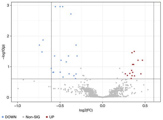 Visualization of changes in metabolite patterns by volcano plots using univariate analysis. Volcano plots show the statistically significantly altered metabolites (FDR-corrected p-value < 0.25, raw p-value < 0.05, and FC > 1.2 or <0.83). n = 15 per group with data from combined central, peripheral, and middle placental samples from each individual. The x-axis indicates log2 (fold change) vs. the MHO group, and the y-axis indicates −log10 (p-value). The levels of 22 metabolites were downregulated (blue) and 15 were upregulated (red) in the MHO group compared to the control group.