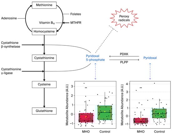 Metabolite changes revealed decreases in vitamin B6 forms in the placentae from the MHO group. Pyridoxal phosphate (pyridoxal 5′-phosphate) is the active form of vitamin B6 (pyridoxine or pyridoxal) and acts as a coenzyme in transsulfuration and glutathione biosynthesis. Pyridoxal phosphate may also directly react with peroxy radicals and thereby scavenge radicals. Box plots of pyridoxal and pyridoxal phosphate abundance (metabolite peak pair intensity) in the MHO (red boxes) and control (green boxes) groups are displayed. ** significant difference between placentae from women with MHO and controls, p < 0.01. n = 15 per group. MTHFR = methionine synthase reductase, PDXK = pyridoxal kinase, PLPP = pyridoxal 5-phosphate phosphatase.