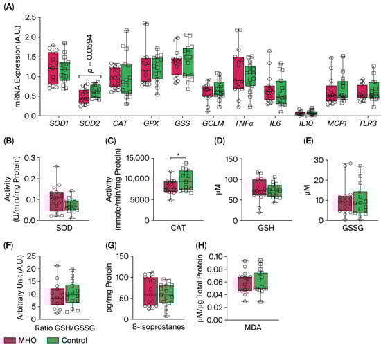 mRNA levels of expression of superoxide dismutase 1 (SOD1), catalase (CAT), glutathione peroxidase (GPX), Glutathione synthetase (GSS), and glutamate-cysteine ligase modifier subunit (GCLM) were not affected in the MHO group compared to the control group (p > 0.10, Cohen’s d ≤ 0.3, Figure 8A). Conversely, a moderate decrease in the expression of SOD2 was observed in the MHO group (−21%, p = 0.0594, Cohen’s d = 0.7). The mRNA expression of proinflammatory markers including tumor necrosis factor α (TNFα), interleukin 6, 10 (IL6, IL10), monocyte chemoattractant protein 1 (MCP1), and Toll-like receptor 3 (TLR3) was not affected in the MHO group (p > 0.10, Cohen’s d < 0.3, Figure 8A). While SOD activity was not significantly impacted (p = 0.10, Cohen’s d = 0.6), CAT activity was lower in the MHO group (−16%, p < 0.05, Cohen’s d = 0.7) (Figure 8B,C). GSH and GSSG concentrations and the ratio of GSH:GSSG did not differ between the MHO and control groups (p > 0.7, Cohen’s d < 0.2; Figure 8D–F).
