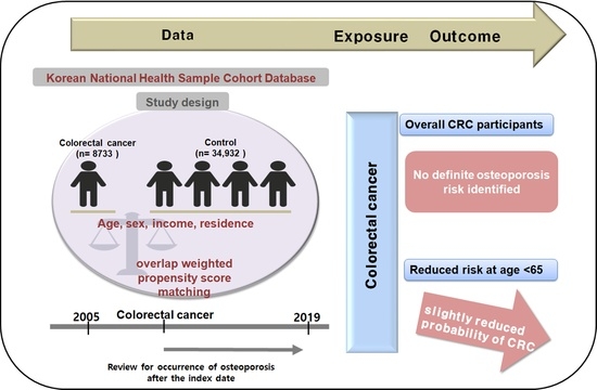 - Nam, J.H.; Koh, M.; Kang, H.W.; Ryu, K.H.; Lee, D.S.; Kim, S.H.; Jang, D.K.; Jeong, J.B.; Kim, J.W.; Lee, K.L.; et al. Osteoporosis Is Associated with an Increased Risk of Colorectal Adenoma and High-Risk Adenoma: A Retrospective, Multicenter, Cross-Sectional, Case-Control Study. Gut Liver 2022, 16, 269–276. [Google Scholar] [CrossRef] [PubMed]