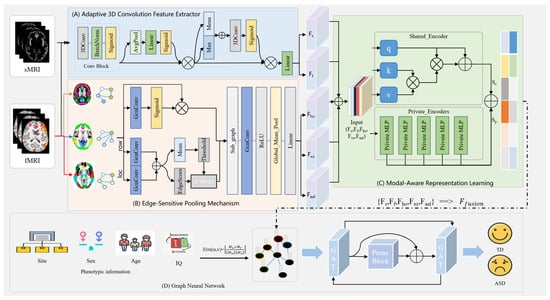 As shown in Figure 1, the proposed DAGMNet framework is mainly composed of four components: (A) an adaptive 3D convolution feature extractor for sMRI and fMRI, (B) an edge-sensitive pooling mechanism (ESPM) for fMRI, (C) a modal-aware representation learning module, and (D) a phenotype-guided population graph learning module. Specifically, sMRI data are processed through a series of adaptive 3D convolution blocks to extract structural features at the subject level, in which the dual-branch design uses both average-pooling and maximum-pooling signals to enhance feature expression capabilities. fMRI data are first converted from multiple spatial perspectives to graph representations, and refined functional connection patterns are extracted through a multi-stage graph convolutional network with edge pruning and edge-sensitive pooling. The features extracted from the two modalities are input into the modal-aware representation learning module, which contains a shared encoder and multiple private encoders to separate cross-modal shared representations from modal-specific representations.