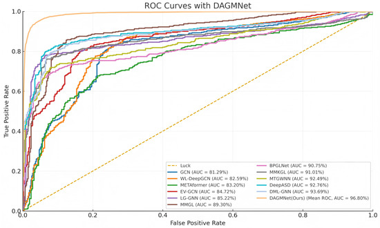 Receiver Operating Characteristic (ROC) curves of DAGMNet and baseline models. DAGMNet achieves the highest AUC, indicating superior prediction performance between the ASD and control groups.