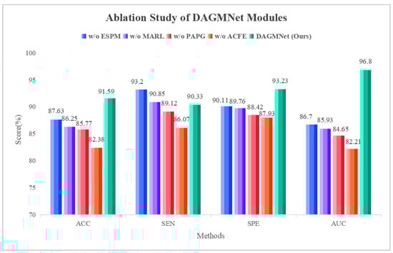 To validate the effectiveness of each module within DAGMNet, we conduct a series of ablation experiments by selectively removing key components: the edge-sensitive pooling (ESPM), the multimodal aware representation learning (MARL), the phenotype aware population graph (PAPG), and the sMRI feature branch (ACFE). As shown in Table 2, removing the edge-sensitive pooling (w/o ESPM) causes a noticeable drop in AUC (from 96.80% to 86.70%), indicating that adaptive pruning and edge-weighted pooling are crucial for extracting informative graph features from fMRI. Eliminating the fusion module (w/o MARL) further degrades performance, reducing the accuracy to 86.25%, confirming that cross-modal interactions learned via shared private encoders are essential for robust representation learning. When the phenotype-aware graph neural network is removed (w/o PAPG), accuracy declined by nearly 6%, highlighting the benefit of incorporating demographic factors such as age, sex, site, and IQ to model population-level subject similarity. Lastly, removing the sMRI branch (w/o ACFE) yielded the worst performance (AUC = 82.21%), emphasizing the complementary role of structural features in ASD diagnosis. These results confirm that each component of DAGMNet plays a vital role in achieving state-of-the-art performance. As shown in Figure 3, the ablation study demonstrates that removing any module degrades performance, while the complete DAGMNet consistently achieves the best results. In particular, the ACFE module proves essential, as its removal leads to the largest drop across all metrics (ACC, SEN, SPE, and AUC). These results confirm that each component contributes to the final performance, with ACFE playing the most critical role.