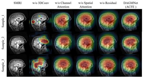 To assess the contribution of each sub-component in ACFE, we conduct both qualitative and quantitative ablation studies. As shown in Figure 4, removing any module leads to less focused and less interpretable activation maps. In contrast, the full ACFE consistently highlights concentrated and meaningful brain regions, which are highly relevant to ASD prediction. As shown in Table 3, the quantitative results further validate these findings. The full ACFE model achieves the highest performance (ACC = 91.59%, SEN = 90.33%, SPE = 93.23%, AUC = 96.80%). Removing 3D convolution results in the largest performance degradation (ACC = 83.20%, AUC = 84.00%), highlighting its essential role in capturing 3D structural information. Removing channel or spatial attention also leads to notable drops in AUC (≈89%), confirming the effectiveness of attention mechanisms in enhancing feature discriminability. The residual connection contributes moderately, improving stability and generalization.