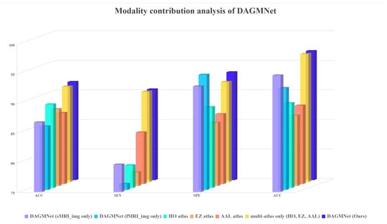 We validate the effectiveness of different input modalities on model performance, including sMRI, fMRI, and multi-atlas data. As shown in Table 4, using only sMRI or fMRI results in relatively lower accuracy and AUC. Notably, introducing multi-atlas fMRI graphs leads to a significant performance boost, demonstrating the benefit of incorporating diverse functional parcellations. Our proposed DAGMNet model, which fuses both structural and multi-source functional features, achieves the best results. This highlights the importance of comprehensive multimodal fusion in capturing complementary anatomical and functional patterns for ASD prediction. The DAGMNet integrates atlas-free image streams with multi-atlas graph inputs via modality-aware fusion and dynamic graph learning, further increasing specificity while maintaining maximal AUC. This confirms that the proposed design reduces dependence on predefined atlases through two complementary mechanisms: inclusion of atlas-independent feature pathways and use of a diverse atlas ensemble to stabilize graph representations.