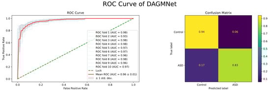 As shown in Figure 6, the average ROC curve presents over 10-fold cross-validation. The red line represents the mean ROC across all folds, and its high and smooth shape indicates consistently strong performance in every validation split. This result demonstrates that DAGMNet achieves not only high prediction accuracy but also excellent robustness and generalizability across different data partitions.