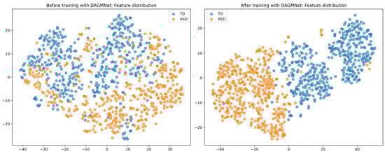 As shown in Figure 7, before DAGMNet training, the data points are widely scattered, with considerable overlap between the visualisation of ASD and control groups, reflecting poor discriminative structure. However, after training, the learned representations are well-separated and exhibit clear clustering patterns, indicating that DAGMNet effectively captures meaningful and modality-integrated features.