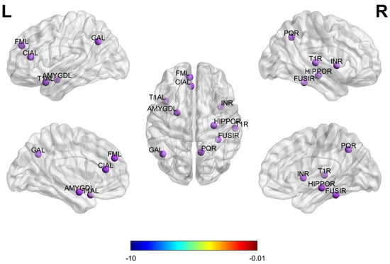 To identify the most discriminative brain regions for the diagnosis of ASD, this study utilizes the ESPM, which adaptively selects nodes from multi-atlas brain networks. During model training, the module suppresses less informative nodes and prunes weak connections while preserving and reweighting the most discriminative ones to highlight key information. The node importance coefficients () outputs by the ESPM are aggregated and ranked by their average scores so that the top 10 regions of interest (ROIs) can be selected as candidate neuroimaging biomarkers. The 10 brain regions most important for ASD classification are presented in Figure 8, which was generated using the BrainNet Viewer toolbox [29]. Functionally, these ROIs encompass multiple brain networks. The amygdala and hippocampus are involved in emotional regulation and memory processing [12]; the fusiform gyrus, superior temporal gyrus, and temporal pole are associated with social perception and face recognition; the insula is related to emotional processing [30]; the anterior cingulate cortex and medial superior frontal gyrus are implicated in cognitive control and self-referential processing; and the precuneus and angular gyrus serve as core nodes of the default mode network supporting social cognition and memory retrieval. The key brain regions identified in this study align closely with abnormal regions reported in multiple ASD neuroimaging studies [26,27,31], which further validates the reliability and scientific value of the proposed biomarker detection method.