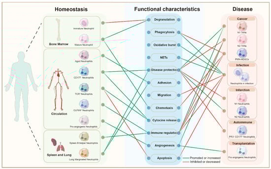 Neutrophil Heterogeneity Across Homeostasis and Disease States: this bipartite graph illustrates the functional characteristics of different neutrophil subsets across various stages of homeostasis and disease. On the left, neutrophil subpopulations derived from different anatomical sites (bone marrow, circulation, spleen, and lung) are depicted, including immature, mature, aged, and specialized subsets such as CD177+, TCR+, OLFM4+ neutrophils, and pro-angiogenic neutrophils. These subsets are linked to their functional characteristics, including degranulation, phagocytosis, oxidative burst, NET formation (NETs), disease protection, adhesion, migration, chemotaxis, cytokine release, immune regulation, angiogenesis, and apoptosis, as shown in the central node list. The graph contrasts the functional roles of neutrophils under homeostasis (green edges) and in various disease contexts (red edges). The green edges indicate functions that are promoted or increased in specific neutrophil subsets, while the red edges represent functions that are suppressed or decreased. On the right, neutrophil subsets related to different pathologies are shown, including cancer, infection, infarction, autoimmune diseases, and transplantation. This visual representation highlights the dynamic role of neutrophils and their functional shifts across physiological and pathological conditions, contributing to understanding their involvement in disease diagnosis, treatment, and prognosis. Abbreviations: NETs, Neutrophil Extracellular Traps; TANs, Tumor-Associated Neutrophils; PMN-MDSCs, Polymorphonuclear Myeloid-Derived Suppressor Cells; PR3, Proteinase 3; CD177, Cluster of Differentiation 177; TCR, T Cell Receptor; OLFM4, Olfactomedin 4.