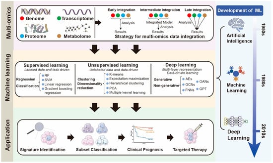 - Arjmand, B.; Hamidpour, S.K.; Tayanloo-Beik, A.; Goodarzi, P.; Aghayan, H.R.; Adibi, H.; Larijani, B. Machine Learning: A New Prospect in Multi-Omics Data Analysis of Cancer. Front. Genet. 2022, 13, 824451. [Google Scholar] [CrossRef]