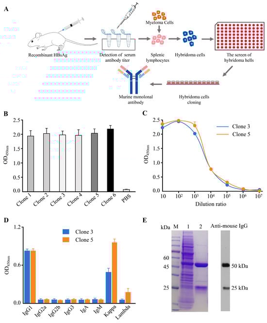The preparation and characterization of murine anti-HBsAg monoclonal antibodies (mAbs). (A) A schematic flowchart of murine anti-HBsAg mAb preparation. BALB/c mice were immunized with recombinant hepatitis B virus surface antigen (HBsAg). Specific antibodies were subsequently screened using hybridoma technology. (B) Screening of hybridoma subclones. Antibodies in the supernatant of hybridoma cell lines were detected by an indirect enzyme-linked immunosorbent assay (iELISA). Six antibody-positive subclones (Clone 1–Clone 6) exhibiting stronger binding affinity to HBsAg were identified based on OD450nm measurements. Data shown are mean ± SD from three replicates. (C) Titer analysis of antibodies from Clone 3 and Clone 5 hybridoma cell culture supernatants. Supernatant antibodies were subjected to 10-fold serial dilutions (1:10 to 1:107), and antibody titers were quantified by measuring OD450nm values. Data shown are mean ± SD from three replicates. (D) Isotype identification of antibodies from Clone 3 and Clone 5 supernatants. The antibody isotypes present in the hybridoma culture supernatants were determined using a commercially available antibody isotyping kit. Data shown are mean ± SD from three replicates. (E) SDS-PAGE (left) and Western blotting analysis (right) of Clone 5 antibody purified from mouse ascites. Lane M: Prestained protein molecular weight ladder; Lane 1: Proteins after caprylic acid-ammonium sulfate precipitation; Lane 2: Antibody purified by Protein A affinity chromatography. The secondary antibody used for WB was HRP-conjugated goat anti-mouse IgG.