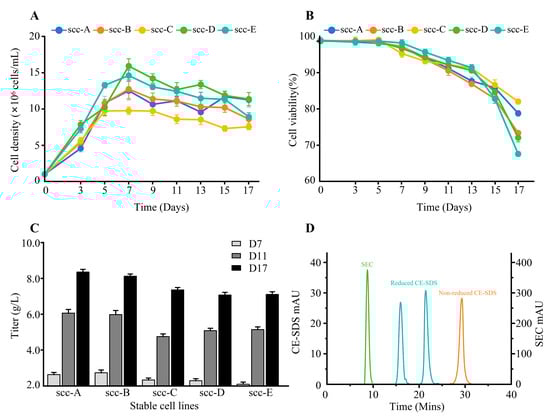 Analysis of cell growth, antibody production, and product quality in 17-day fed-batch culture. (A,B) Cell density and viability monitoring during fed-batch cultures of CHO-K1 cells. Cell lines scc-A to scc-E represent five distinct monoclonal stable clones. (C) Secreted HmAb-12 antibody titers measured on days 7, 11, and 17. (D) Purity analysis of HmAb-12 antibody harvested from scc-A fed-batch cultures on day 17. Size exclusion chromatography (SEC) and capillary electrophoresis-sodium dodecyl sulfate (CE-SDS) were employed for antibody purity assessment. SEC-HPLC (x-axis): Retention time (Minutes); CE-SDS (x-axis): Migration time (Minutes). Data represent mean ± SD (n = 3).