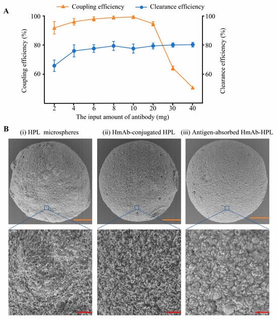 The preparation of HBsAg-specific immunoadsorbents. (A) The coupling efficiency of HmAb-12 (left Y-axis) and HBsAg clearance efficiency of corresponding immunoadsorbents (right Y-axis) versus immobilized HmAb-12 dosage. Data represent mean ± SD (n = 3). (B) Scanning electron microscopy (SEM) analysis of microspheres. Representative SEM images show: (i) unmodified HPL microspheres, (ii) antibody-conjugated microspheres, and (iii) antigen–antibody complex-bound microspheres. Yellow scale bars = 10 μm; red scale bars = 1 μm. Images are representative of three independent replicates.