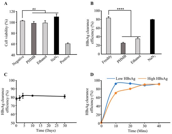 The performance evaluation of HBsAg-specific immunoadsorbents. (A) Cytotoxicity assessment of preservative-treated immunoadsorbents by MTT assay. Negative control: Polyethylene extract; Positive control: 5% DMSO; Test groups: 0.4 g/L PHMB, 20% (v/v) ethanol, 1 g/L NaN3. Data were analyzed using a two-tailed independent Student’s t-test. A p-value > 0.05 was considered not statistically significant (ns). (B) Effect of storage solutions on HBsAg clearance efficiency at 4 °C. Immunoadsorbents were equilibrated at 4 °C in: freshly prepared solution (no preservative), 0.4 g/L PHMB, 20% (v/v) ethanol, or 1 g/L NaN3. Two-tailed unpaired Student’s t-test was performed (**** p < 0.0001). (C) Accelerated stability testing. Clearance efficiency for recombinant HBsAg was measured after storage at 37 °C for 0, 2, 4, 10, and 30 days. (D) Dynamic adsorption efficiency in vitro. Immunoadsorbents packed in 5 mL columns underwent recirculating adsorption with bovine serum containing varying HBsAg concentrations. Residual HBsAg levels were quantified at 10, 20, 30, and 40 min to calculate clearance efficiency. Data represent mean ± SD (n = 3).