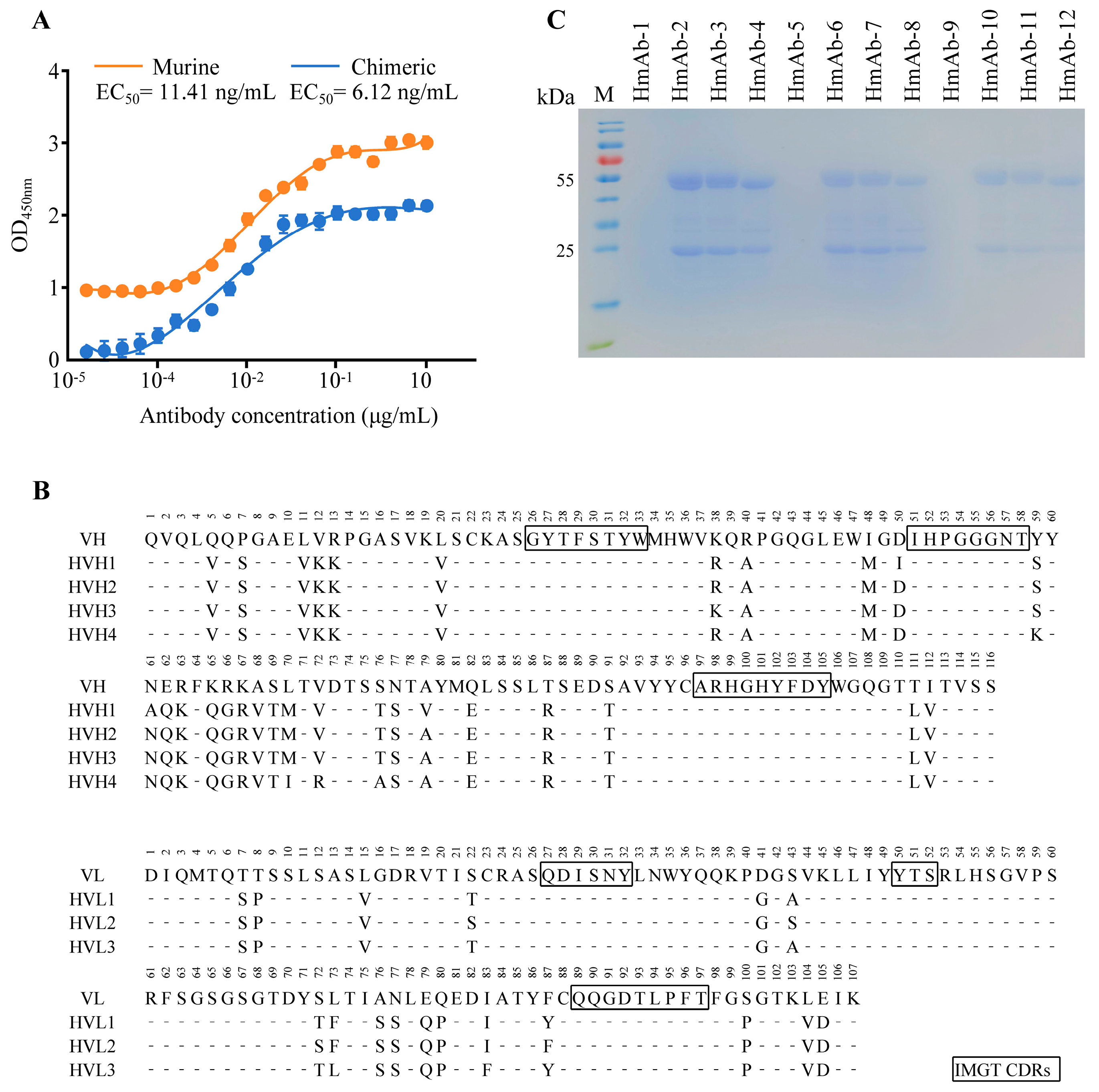 CDRs were identified using the IMGT numbering scheme. Homology modeling, CDR grafting, and optimization of key framework residues via point mutations were performed using the Molecular Operating Environment (MOE 2019.0102) software and antibody structural databases. This resulted in four humanized VH sequences (HVH1-HVH4) and three humanized VL sequences (HVL1-HVL3). These were combinatorially paired to generate 12 humanized antibody variants, designated HmAb-1 to HmAb-12, each comprising humanized variable domains and human immunoglobulin constant domains.