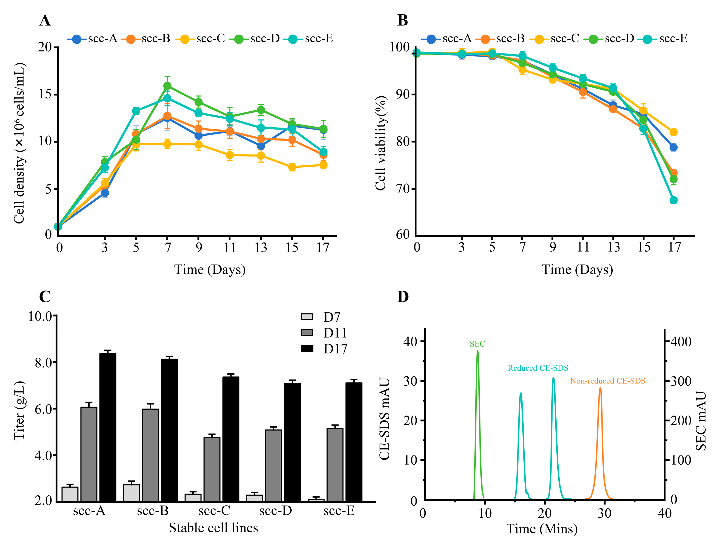 The top five monoclonal cell lines (Top 5) were selected based on their antibody expression levels and cell growth data. The fed-batch culture supernatants from the Top 5 clones were purified using Protein A affinity chromatography. The purified antibody products underwent quality analysis, including size-exclusion chromatography-high-performance liquid chromatography (SEC-HPLC) for purity and capillary electrophoresis-sodium dodecyl sulfate (CE-SDS) for purity assessment.