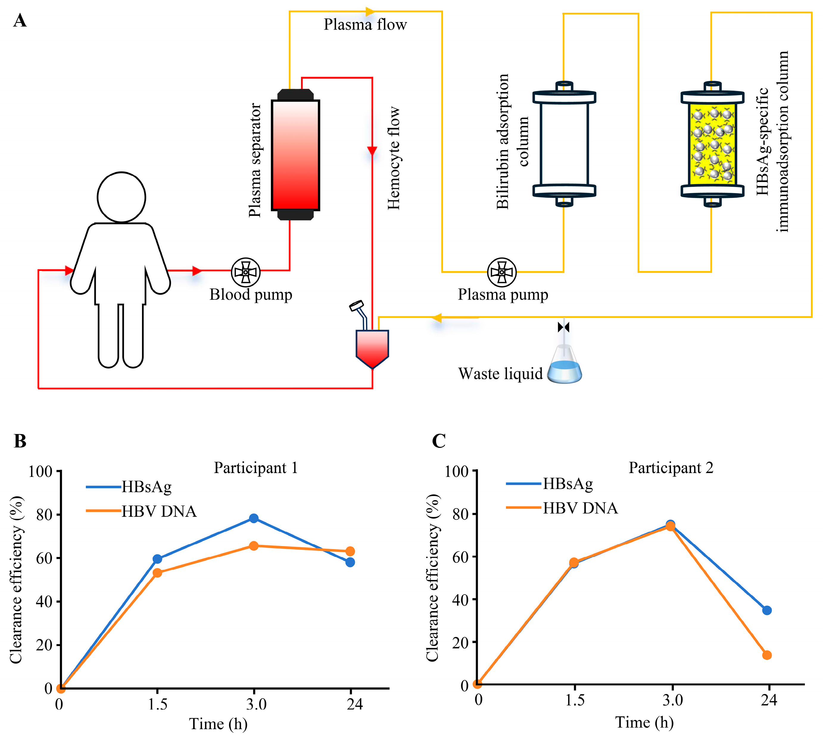 This prospective, single-center preclinical feasibility trial (ethics approval No.: 20230206) was conducted at Wuhan Kane Hospital (Wuhan, China). An extracorporeal plasma purification system was employed, consisting of a plasma separator (Model PE-08, Asahi Kasei Medical Co., Ltd., Tokyo, Japan) connected in series with the developed HBsAg-specific immunoadsorption column (Model HBV-250, Wuhan Refine Medical Devices Co., Ltd., Wuhan, China; column volume, 250 mL; ligand density, 4 mg antibody/g microspheres). Two eligible CHB participants underwent a single extracorporeal purification treatment each.