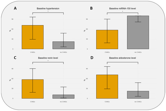 Distributions of population with 95% confidence intervals according to hypertension baseline status (A), thresholds of baseline miR-150-5p level (B), baseline renin level (C), and baseline aldosterone level (D). CVAEs: cardiovascular adverse events. * indicates significant association (p-value < 0.05).