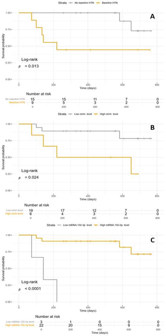 (A) Kaplan–Meyer curve illustrating CVAEs occurrence according to baseline HTN; (B) Kaplan–Meyer curves illustrating CVAEs occurrence according to baseline plasmatic renin level; (C) Kaplan–Meyer curves illustrating CVAEs occurrence according to baseline miR-150-5p level. HTN: hypertension.