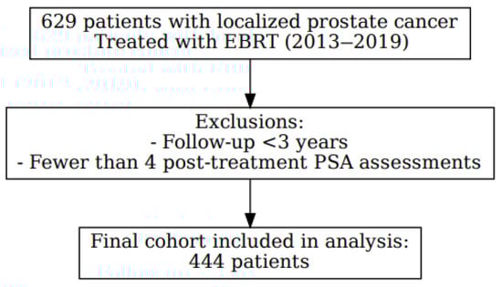 We conducted a retrospective cohort study, including 629 patients diagnosed with localized PC and treated exclusively with EBRT, with or without ADT (Luteinizing hormone-releasing hormone [LHRH] agonists), between December 2013 and December 2019 at a single institution. After applying the exclusion criteria, which required a minimum follow-up of three years and at least four post-treatment PSA assessments, a total of 444 patients were included in the final analysis (Figure 1). All cases were reviewed by a multidisciplinary tumor board, and written informed consent was obtained from all participants. The study was conducted in accordance with the principles of the Declaration of Helsinki and was approved by the Clinical Research Ethics Committee of Hospital Universitario de Terrassa (approval code: 02-21-100-020). The study was also registered under ClinicalTrials.gov identifier NCT06092918.