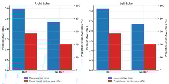 A higher tumor burden was observed in biopsy samples from patients with BCR, both in terms of the mean number of positive cores per lobe and the proportion of positive cores relative to the total number of sampled cores. The proportion of positive cores was consistently higher in the BCR group compared to the non-BCR group across both lobes (57% vs. 41%, respectively) (Table 1). Specifically, in the right lobe, the mean number of positive cores was 2.98 in the BCR group vs. 2.33 in the non-BCR group (p = 0.014); in the left lobe, 3.13 vs. 2.36 (p = 0.007); and for the total number of positive cores, 6.11 vs. 4.71 (p = 0.01). The differences in proportions between groups were also statistically significant (right lobe: p = 0.046; left lobe: p = 0.048; total: p = 0.005) (Figure 2).