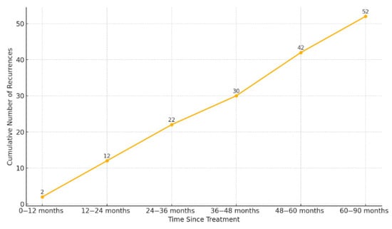 Cumulative incidence of biochemical recurrence over time. Footnotes: The figure shows the number of recurrences accumulated at different time intervals after radiotherapy.