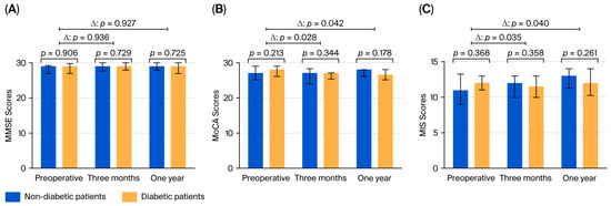 One year after surgery, individual changes in the MMSE score were not significantly different between the groups (p = 0.921), whereas the decline in the MoCA score was greater in diabetic patients than in nondiabetic patients (p = 0.042). The MIS scores were significantly different in the 12th month between diabetic and nondiabetic patients (p = 0.042).