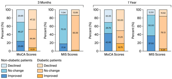 Cognitive improvement based on the MoCA test was less likely to occur in diabetic patients than in nondiabetic patients (p = 0.029) one year after surgery. Similarly, improvement based on the MIS scores was significantly greater in the nondiabetic group (p = 0.002) at the time of this assessment. The data are shown in Figure 3.