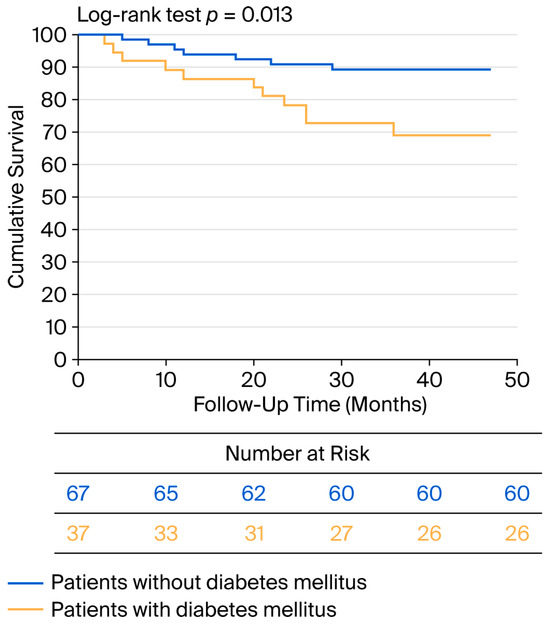 No patient died within the first 30 days after surgery. During the perioperative period, MACCEs occurred in four patients, three of whom had diabetes (p = 0.087). Additionally, two patients experienced TIA. During the 34-month average follow-up period, eleven patients died, four of whom experienced MACCE-related events. All-cause mortality was greater in the diabetic group compared with the nondiabetic group (p = 0.040). During the follow-up, eleven patients experienced MACCEs, seven of whom had diabetes (p = 0.040). A Kaplan–Meier analysis was performed for worse postoperative outcome (survival + major cardiovascular and cerebrovascular event), and the curve is shown in Figure 4.
