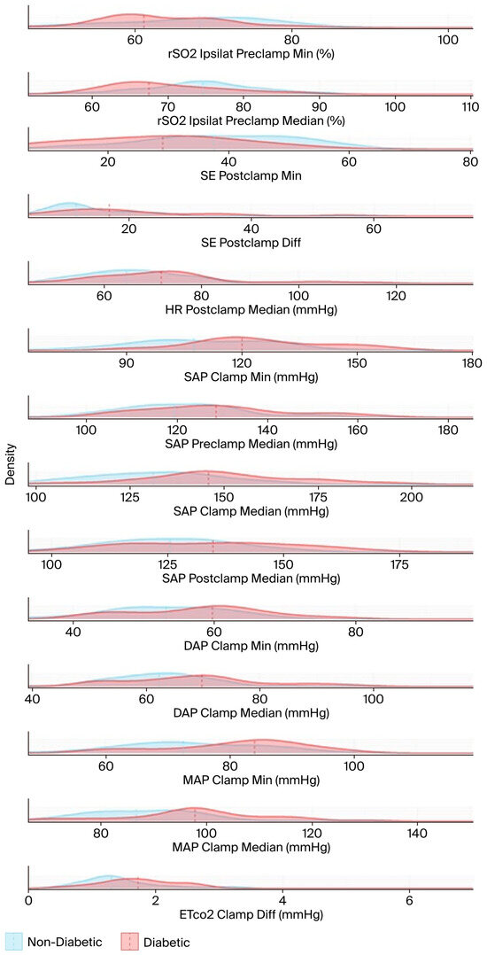The results in Table A1 and Table A2 are based on hypothesis tests and are visualized using stacked density plots in Figure 5. Each plot shows the distribution of diabetic (in red) and non-diabetic (in blue) patient groups for the respective variable. The central tendency (in this case, the median) of each group is indicated by a dashed line. The X-axes are not aligned to enhance visual clarity. The median, the minimum (calculated using a sliding window of 10 timestamps), and the difference between the minimum and the median were computed for each variable.