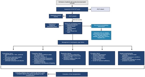 As previously mentioned, infections, and particularly bacterial infections, represent the most common precipitating event for ACLF in Europe [2,18]. Therefore, a comprehensive diagnostic assessment of a patient with ACLF should always include the collection of blood cultures, urine, and ascites fluid samples for microbiological testing, in addition to a medical history and physical examination [22]. A chest X-ray is recommended as part of the initial diagnostic work-up, particularly in patients with respiratory symptoms [26]. If no infectious focus can be identified but clinical suspicion remains high, further diagnostic measures such as abdominal ultrasonography or computed tomography may be warranted. If a bacterial infection is suspected as the underlying precipitating event, initial therapeutic management should involve the administration of broad-spectrum antibiotics. The selection of an appropriate antibiotic regimen must take into account regional factors, local patterns of antimicrobial resistance, and patient-specific resistance profiles [22]. The critical importance of early broad-spectrum antibiotic initiation is underscored by a prospective study involving more than 1100 patients with decompensated cirrhosis, which demonstrated that extensively drug-resistant bacteria (XRD) were more frequently detected in patients with ACLF compared to those without ACLF [27].
