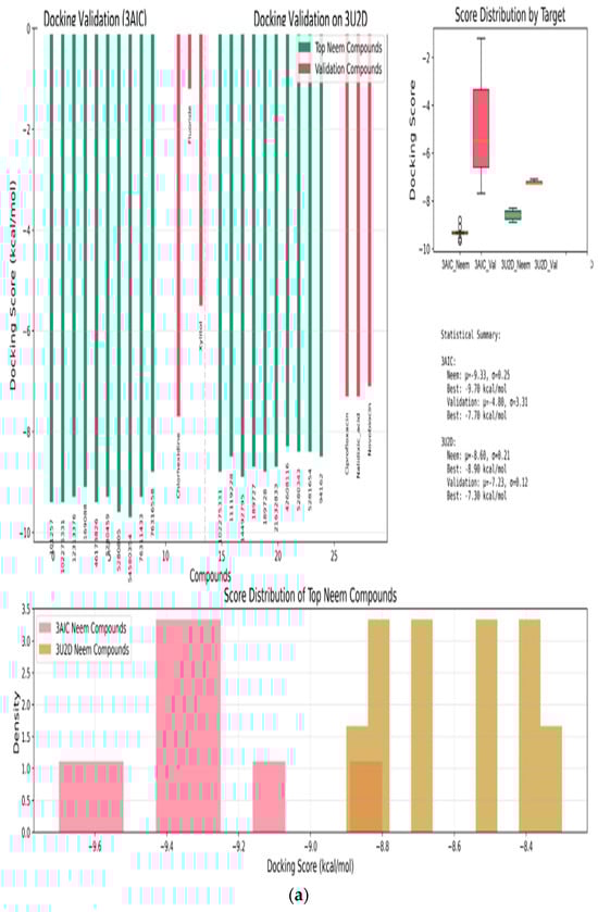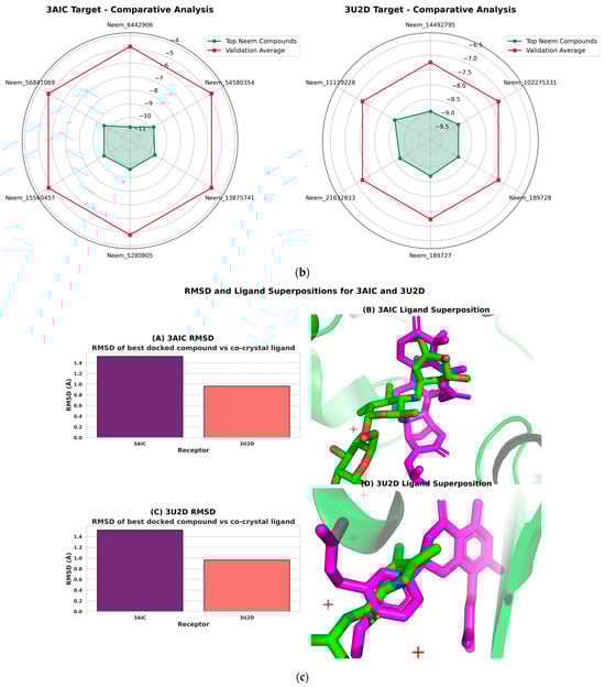 The molecular docking validation was performed against the two therapeutic targets: 3AIC for local dental caries treatment and 3U2D for the systemic intervention. The results showed a superior binding performance of neem compounds against the local target 3AIC, with the docking scores ranging from −9.31 to −4.80 kcal·mol−1 (μ = −9.31, σ = 0.25), which outperformed the validation compounds (Figure 12a). For the systemic target 3U2D, the neem compounds showed moderate binding affinity (−8.60 to −7.30 kcal·mol−1, μ = −8.60, σ = 0.21), also with more consistent performance compared to validation compounds. Some of the best compounds on 3AIC are Neem_PDB_6442906 (Nimocinolide), Neem_PDB_54580354 (7-Benzoylnimbocinol), Neem_PDB_13875741 (Nimbocinol), and Neem_PDB_5280805 (Rutin), while 102275331 ([(1R,4bR,5S,6R,8R,10S,10aR,10bR,12aR)-6,8-diacetyloxy-1-(furan-3-yl)-5-hydroxy-4b,7,7,10a,12a-pentamethyl-3-oxo-1,5,6,6a,8,9,10,10b,11,12-decahydronaphtho[2,1-f]isochromen-10-yl] (E)-3-phenylprop-2-enoate), 11119228 (Nimbiol), 14492795 (Nimbaflavone), and 189727 (Isomargolonone) are some of the best on 3U2D (Figure 12a). The score distribution analysis showed that neem compounds exhibited preferential binding toward the local dental caries target (3AIC), with most compounds clustering in the optimal binding range of −9.4 to −9.2 kcal·mol−1. The comparative radar plot (Figure 12b) revealed the selectivity confirmation of the leading neem compounds consistently doing better than the validation compounds for local treatment and retaining good systemic activity. The results of this study reveal that the neem-derived compounds possess nice pharmacological profiles for targeted dental caries therapy with enhanced local activity and moderate activity and systemic bioavailability. The RMSD chart clearly indicates that the docking study performed well against both crystal structures, with the 3U2D structure showing particularly excellent agreement (Figure 12c).