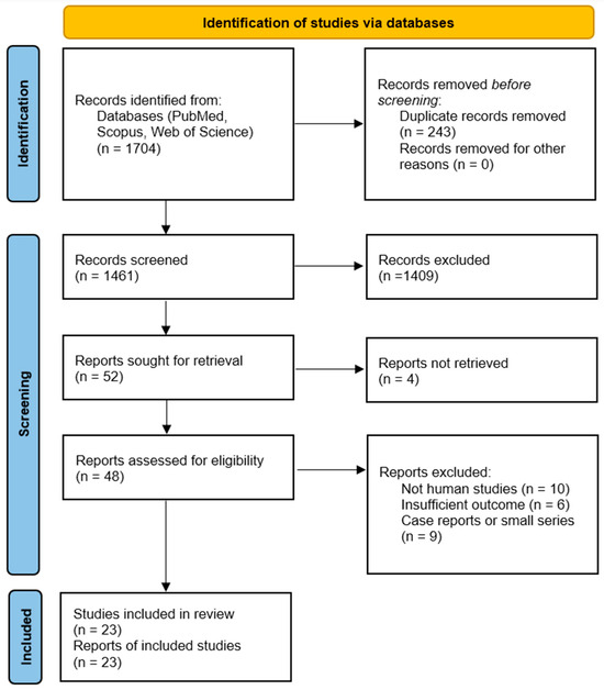 PRISMA 2020 flow diagram illustrating the study selection process for the systematic review and meta-analysis of cytokines in breast cancer. A total of 1704 records were identified across three databases (PubMed, Scopus, and Web of Science), and 23 studies met the inclusion criteria after screening and eligibility assessment based on predefined criteria and PRISMA guidelines.