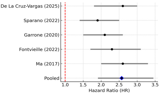 Forest plot of studies reporting the association between elevated IL-6 levels and overall survival in breast cancer. Five studies (n ≈ 1062) were included; pooled HR = 2.57 (95% CI: 1.91–3.45; random effects), I2 = 69% (95% CI: 25–89%; Q p = 0.01), PI = 1.38–4.77. Diamond denotes pooled HR with 95% CI. Between-study heterogeneity (I2, 95% CI) and the 95% prediction interval are reported in the legend [6,7,12,17,18].