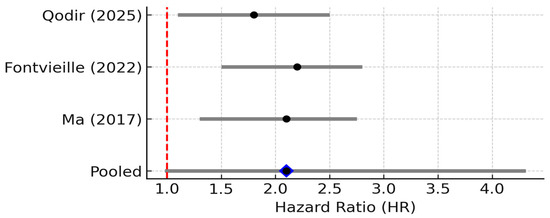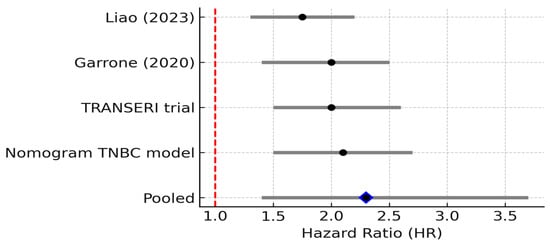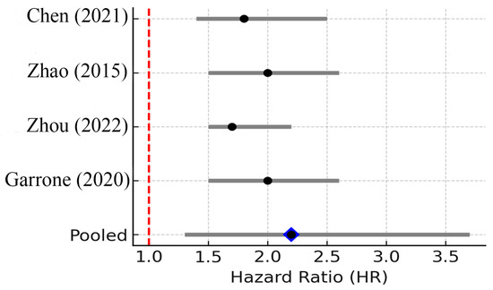 Four studies were included. The pooled HR was 1.97 (95% CI: 1.31–2.96; random effects), with no detected heterogeneity (I2 = 0%, 95% CI: 0–85%; p = 0.45). The 95% PI matched the CI (1.31–2.96), indicating high consistency in the direction and magnitude of effect. IL-8 is a chemokine that recruits neutrophils and promotes angiogenesis and epithelial-to-mesenchymal transition; elevated IL-8 levels have been associated with aggressive disease phenotypes. In breast cancer tissues, IL-8 is often overexpressed, especially in more aggressive subtypes such as triple-negative breast cancers (TNBCs) [29]. Sources of IL-8 in the tumor microenvironment include tumor cells themselves, tumor-associated macrophages, and interestingly, cancer-associated adipocytes; the latter have been shown to secrete IL-8 that promotes tumor growth and invasion in the breast tissue milieu [30]. IL-8 signals through the G-protein-coupled receptors CXCR1 and CXCR2 on target cells. Mechanistically, IL-8 promotes tumor progression by (a) directly stimulating cancer cell motility and invasion, (b) inducing angiogenesis (IL-8 is a pro-angiogenic factor that can spur new blood vessel formation to feed the tumor), and (c) recruiting pro-tumor immune cells, such as neutrophils and myeloid cells that can release proteases and growth factors aiding metastasis [29,30]. IL-8 is also implicated in the epithelial–mesenchymal transition (EMT) of breast cancer cells: it can upregulate Snail and other EMT drivers, thereby increasing the mesenchymal, stem-like phenotype of tumor cells.