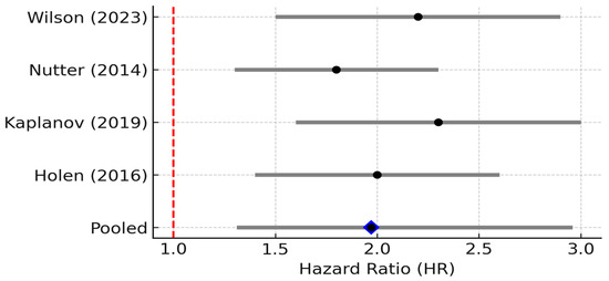 Forest plot of studies reporting the association between elevated IL-8 levels and overall survival in breast cancer. Four studies were included; pooled HR = 1.97 (95% CI: 1.31–2.96; random effects), I2 = 0% (95% CI: 0–85%; Q p = 0.45), PI = 1.31–2.96. Diamond denotes pooled HR with 95% CI. Between-study heterogeneity (I2, 95% CI) and the 95% prediction interval are reported in the legend [14,21,25,26].