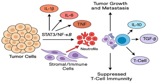 Mechanistic Roles in Tumor Progression: The cytokines reviewed act on both tumor cells and the surrounding stromal/immune cells to promote a vicious cycle of tumor progression. IL-6 and IL-1β activate STAT3/NF-κB pathways in tumor cells, enhancing proliferation, invasion, and stemness [14,15,40,41,42]. TNF-α and IL-17 further amplify these pathways and drive EMT and angiogenesis. IL-8 directly fosters metastasis by attracting neutrophils and endothelial cells, creating channels for tumor spread. Meanwhile, IL-10 and TGF-β skew the immune microenvironment toward suppression, allowing tumor cells to evade immune destruction. These mechanisms are interlinked; for instance, IL-1β can induce IL-6 and IL-8, which in turn recruit myeloid cells that secrete more IL-1β and TNF, sustaining chronic inflammation [14,43,44,45]. Figure 7 summarizes how cytokine networks simultaneously drive tumor cell-intrinsic programs of growth, invasion, and stemness (via STAT3/NF-κB activation) and extrinsic immune suppression (via IL-10/TGF-β-mediated inhibition of antigen presentation and T-cell function). For example, IL-1β can induce IL-6 and IL-8, which recruit and polarize myeloid cells that further secrete pro-tumor cytokines, thereby sustaining a feed-forward inflammatory circuit; conversely, blockade of IL-1β or IL-6 in preclinical models reduces metastatic seeding and restores cytotoxic T-cell activity. The figure is intended as a mechanistic map linking the cytokines we review to the major cellular and molecular consequences relevant to prognosis and therapy.