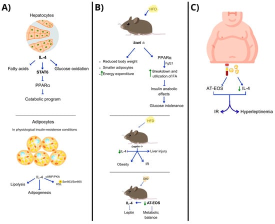 Studies determining the role of IL-4 in metabolism. (A) In hepatocytes, IL-4, via STAT6, regulates glucose metabolism by inhibiting PPAR-α and its metabolic program, while in adipocytes, it promotes lipase phosphorylation to inhibit lipolysis and adipogenesis during physiological insulin resistance. (B) Animal studies on high-fat diets show that IL-4 signals through STAT6; its deletion activates PPAR-α, which promotes fatty acid utilization and breakdown. In leptin-deficient conditions, decreased IL-4 levels lead to insulin resistance and obesity. In diet-induced obesity (DIO) models, IL-4 inhibits leptin, improving IR. This model also shows a decrease in AT-EOS, leading to metabolic balance disruption. (C) Obesity levels in humans inversely correlate with IL-4 levels and eosinophil numbers in adipose tissue and serum, which contribute to insulin resistance and hyperleptidemia.