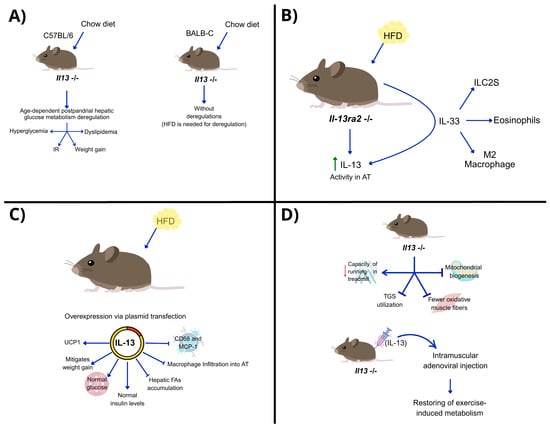 Over the past decade, studies have confirmed the role of IL-13 in metabolism, particularly glucose homeostasis and gluconeogenesis (Table 3). Young C57BL/6 mice, genetically deficient in IL-13 and fed a chow diet, exhibit age-dependent postprandial hepatic glucose metabolism deregulation, without increased pro-inflammatory cytokines. These disturbances lead to hyperglycemia, IR, weight gain, and dyslipidemia, resulting in metabolic syndrome. In contrast, BALB/c mice, which are less susceptible to metabolic diseases, do not show deregulation in hepatic glucose levels with IL13 deletion alone; an HFD is needed for metabolic disruption (Figure 2A). Thus, IL-13 is crucial when insulin levels are overwhelmed, such as with aging or overnutrition [55]. In hepatocytes, exogenous IL-13 induces the phosphorylation of STAT3, which suppresses the expression of gluconeogenic genes and thereby reduces glucose production. This activity may be crucial in mice during the postprandial period, when glucose availability can lead to hyperglycemia, highlighting the key role of IL-13 in regulating glucose metabolism via STAT3 [56].
