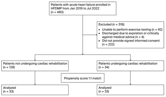 A total of 480 patients with acute HF participated in the HFDMP from January 2019 to July 2022. Among them, 162 patients met both the inclusion and exclusion criteria and agreed to participate in this study. Overall, the early-CR group comprised 34 patients who participated in the phase II exercise training program and continued to undergo home-based CR. In the CR group, 34 patients participated in center-based CR, with a median of 7.0 rehabilitation exercise sessions (IQR: 1.00–27.25). The reasons for not participating in CR include personal preference, transportation issues, caregiver constraints, and medical restrictions. PSM resulted in 33 patients per group (Figure 1).