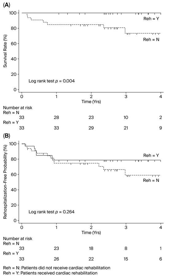 During a median follow-up period of 2.85 years (IQR: 2.33–3.83), patients who underwent CR showed a lower incidence rate of all-cause mortality (0 vs. 87.16 events per 1000 patient-years; rate difference: −0.087 [95% CI: −0.143 to −0.031]; p = 0.002) (Table 3B). However, the beneficial effect of CR on rehospitalization for HF did not reach statistical significance (82.08 vs. 160.90 per 1000 patient-years; rate difference: −0.079 [95% CI: −0.188 to −0.030]; p = 0.156) (Table 3B). Patient survival rates according to participation in CR were examined using Kaplan—Meier curves, and p-values for differences between the early-CR and non-CR groups were calculated using the log-rank test. The log-rank test indicated that CR was associated with a significantly reduced incidence of all-cause mortality (p = 0.004) (Figure 2A); conversely, CR was not associated with a lower incidence of rehospitalization for HF (p = 0.264) (Figure 2B).