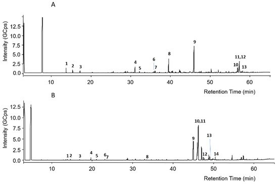 The putative assignment of peaks was conducted by comparison of recorded mass spectra with those in the NIST 2011 mass spectral library or those reported in the literature [37,38,39]. Regarding green propolis, peak numbers reported in Figure 1A were related to the compounds listed in Table 4.
