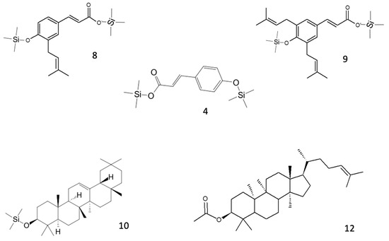 Structures of the main putative compounds identified in green propolis through GC-EI-MS: p-coumaric acid (4), drupanin 2TMS (8), artepillin C 2TMS (9), β-amyrin TMS (10), and cycloartenol acetate (12).