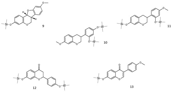 Structures of the main putative compounds identified in red propolis through GC-EI-MS: medicarpin TMS (9), neovestitol 2TMS (10), vestitol 2TMS (11), liquiritigenin 2TMS (12), and formononetin TMS (13).